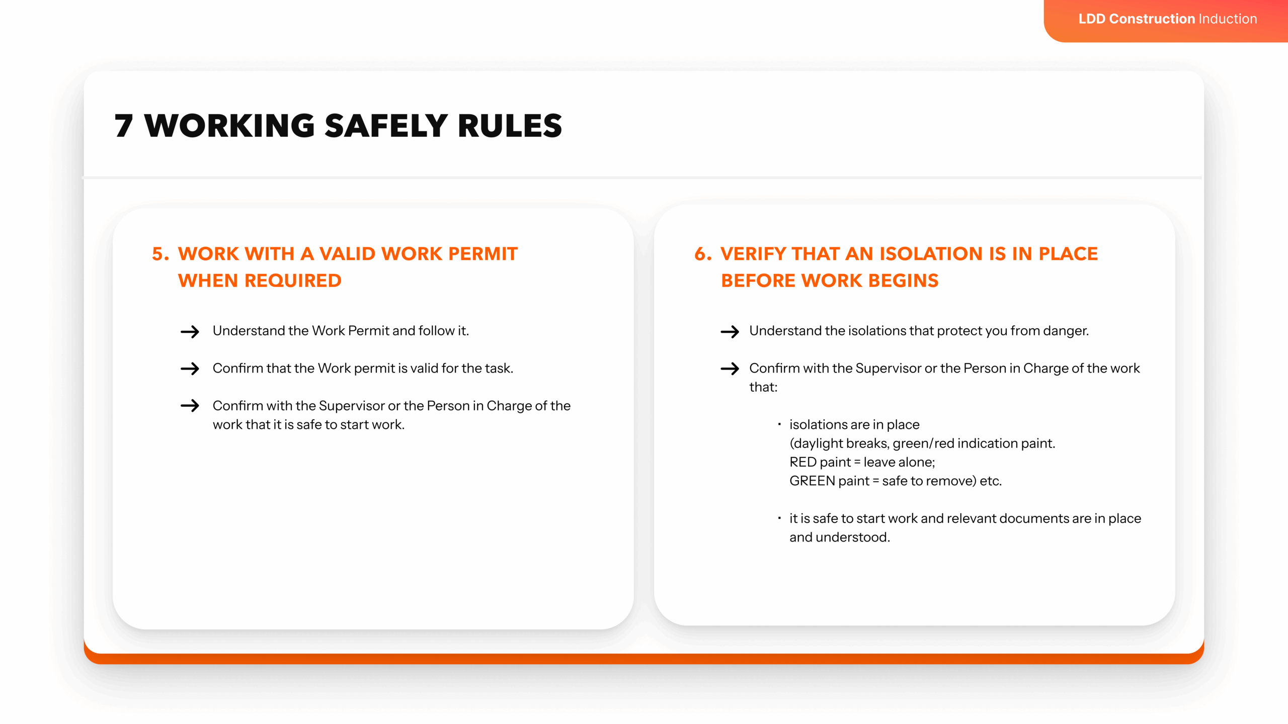 - isolations are in place (daylight breaks, green/red indication paint. RED paint = leave alone; GREEN paint = safe to remove) etc.