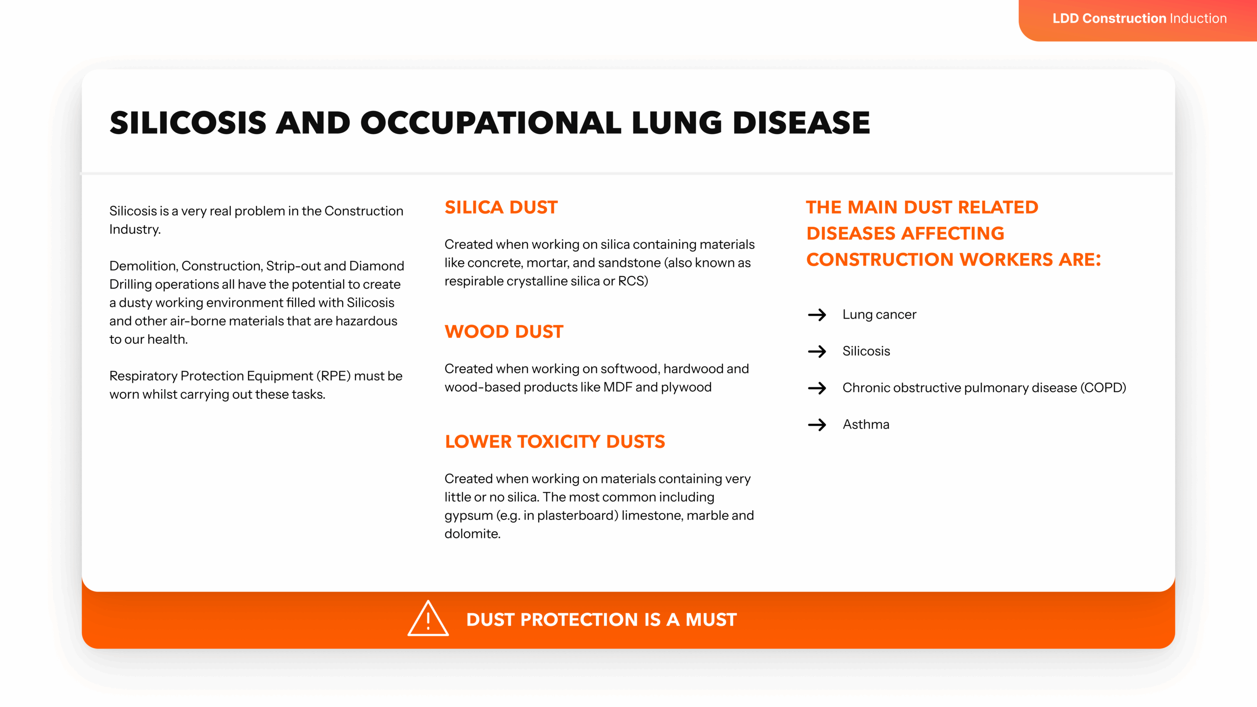 Lower toxicity dusts – created when working on materials containing very little or no silica. The most common including gypsum (e.g. in plasterboard) limestone, marble and dolomite.